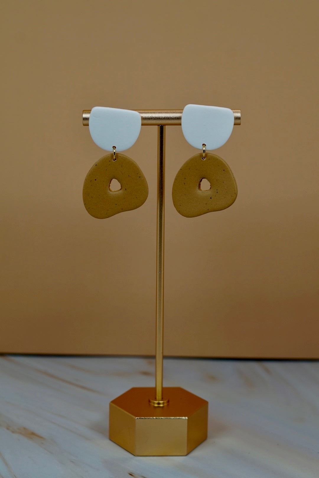 Our earrings are handmade with polymer clay for a lightweight feel and assembled with 18k gold plated hypoallergenic hardware and 6MM Titanium Posts . All of our polymer clay earrings and accessories are designed and handmade in St Louis, Missouri.