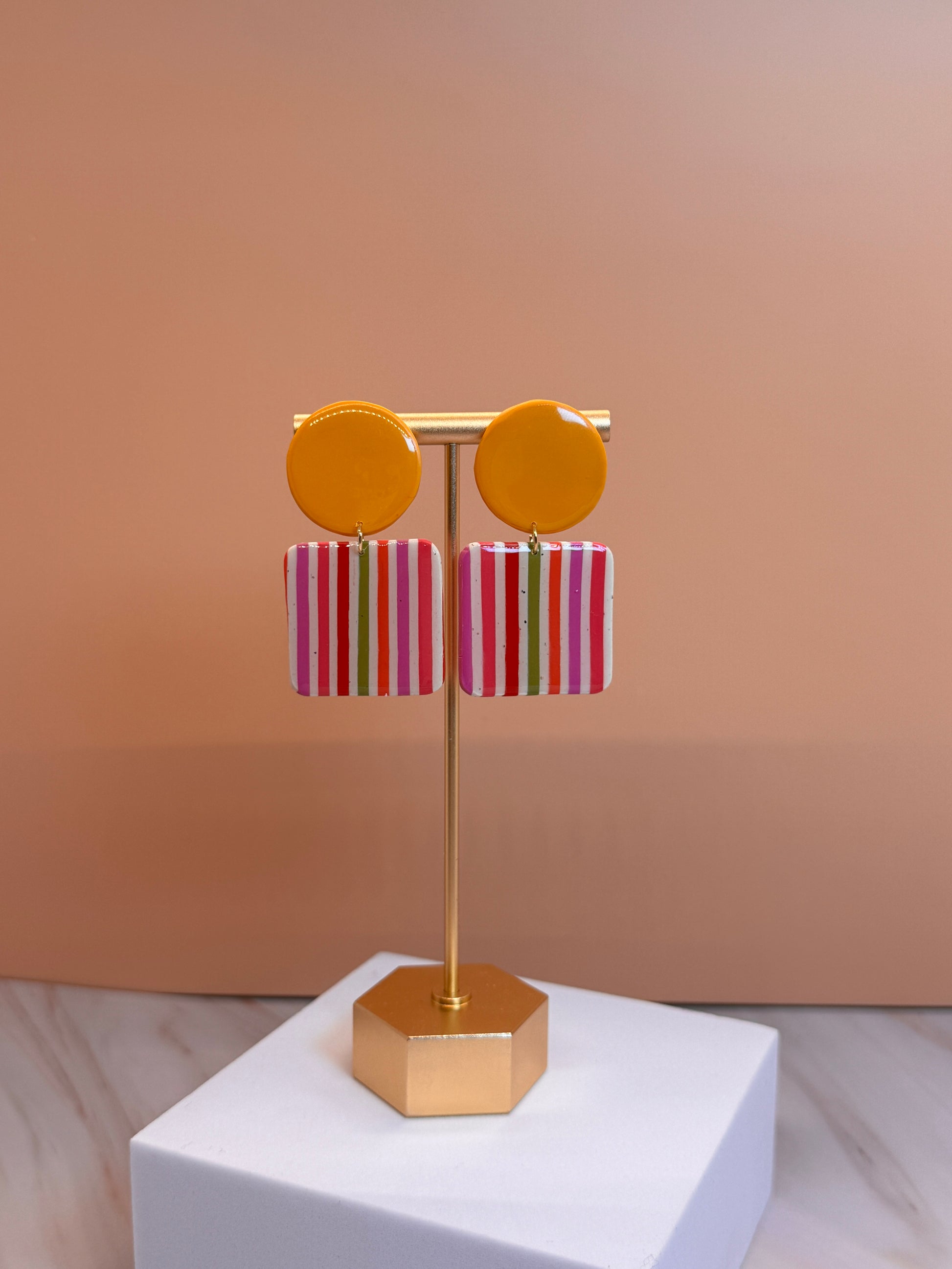 Our earrings are handmade with polymer clay for a lightweight feel and assembled with hypoallergenic hardware and 6MM Titanium Posts . All of our polymer clay earrings and accessories are designed and handmade in St Louis, Missouri.